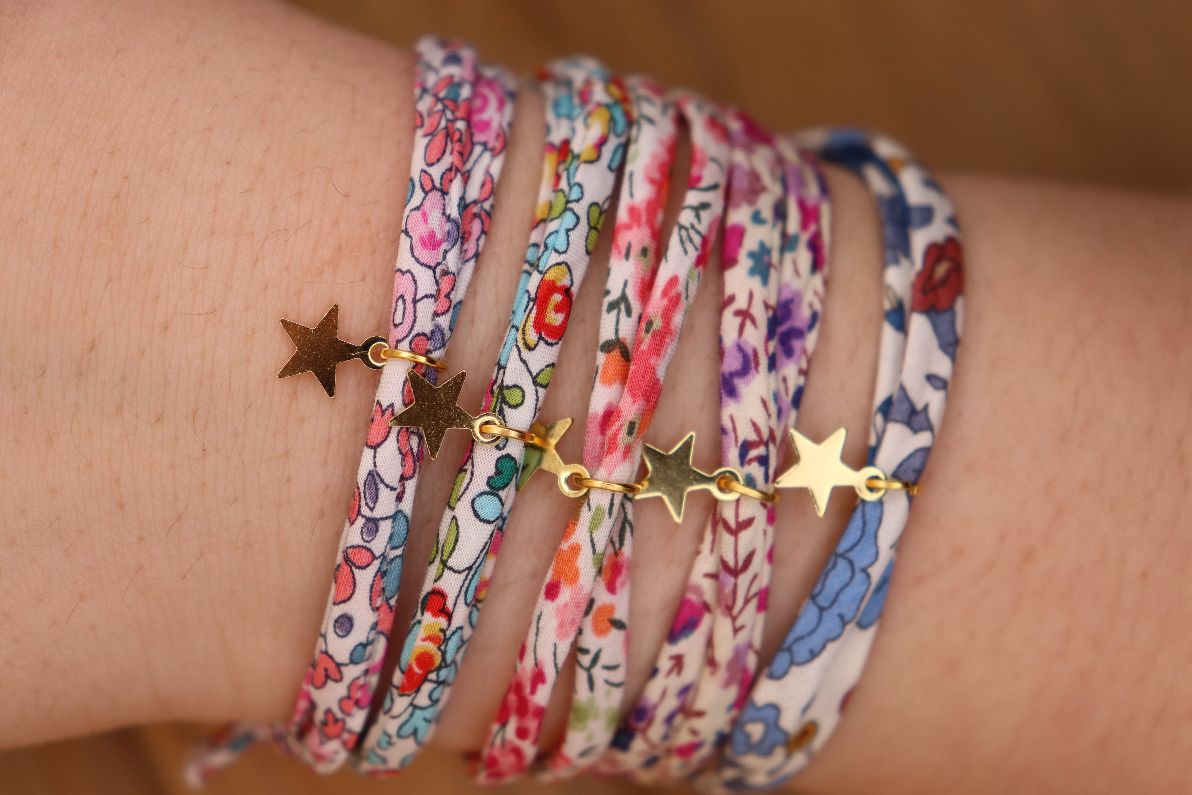 Un bracelet en tissus liberty accompagné d'un charm, dissimuler dans la cire vous offrira un moment magique lors du déballage. Les tissus sont placés de manière aléatoire dans les bougies. (Non anti-oxydant)